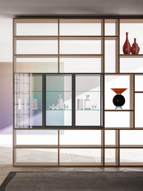 Windy system with floor-to-ceiling poles, charcoal shelves, walnut units with Plana push & pull drop-down doors, walnut wall units with City Glass lift-up doors in fumé transparent glass with a burnished frame; Upholstered Siparium panel, with Creta C06 fabric hanging organisers; walnut desk.